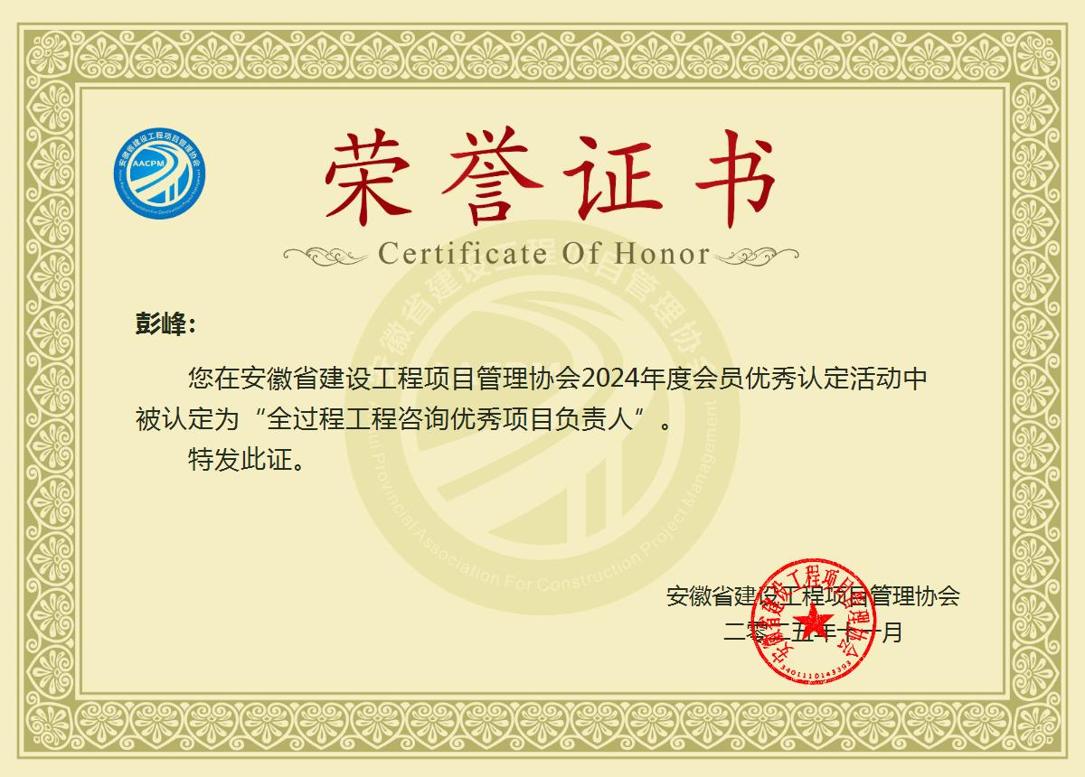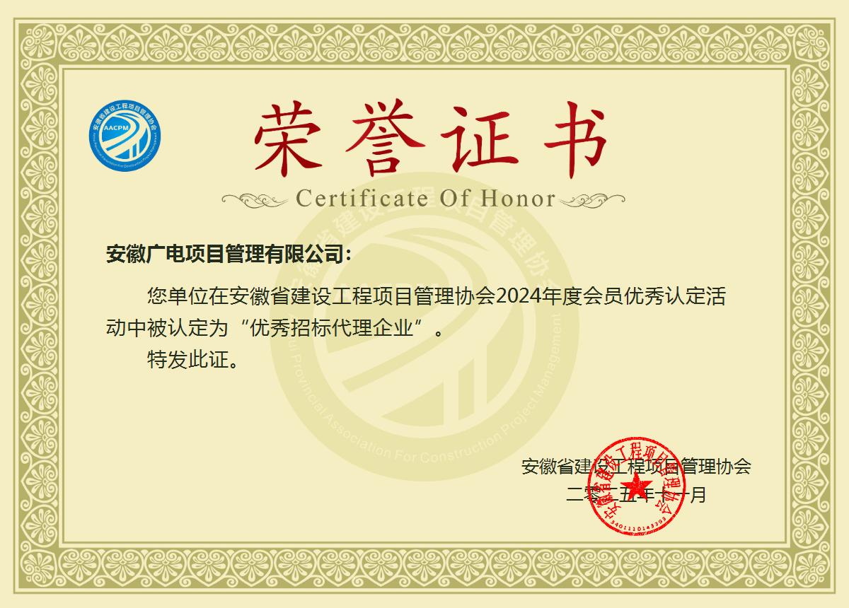 近日,安徽省建设工程项目管理协会发布2024年度会员优秀认定活动名单,安徽广电项目管理有限公司(简称“广电项管”)凭借扎实的专业能力,获评“优秀招标代理企业”;公司全过程事业部彭峰同步斩获“全过程工程咨询优秀项目负责人”荣誉。
